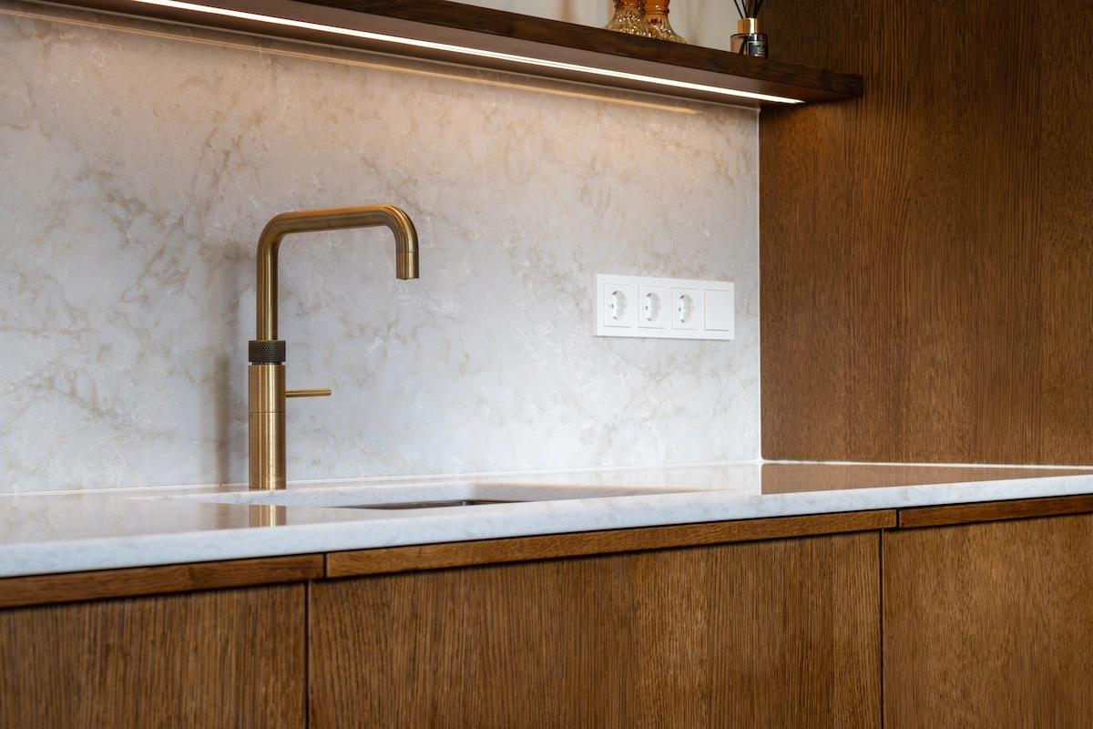 Ook in de details komt het natuurlijke karakter terug. Zo is de keuken voorzien van een Bora kookplaat, Siemens oven, een Quooker in Messing Patina en een massief messing spoelbak. Deze combinatie van materialen en apparatuur zorgt voor een keuken waarin rust, warmte en verfijning samenkomen en die perfect aansluit bij de serene Japandi sfeer van de woning.