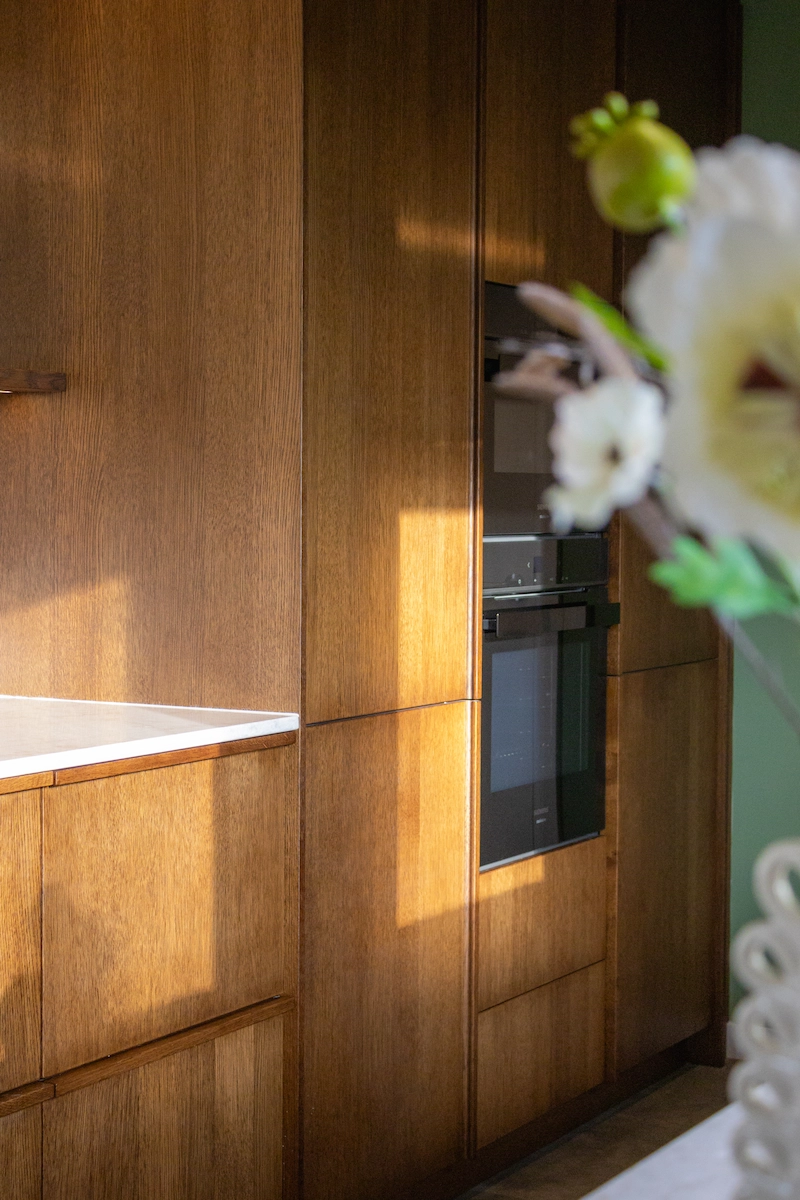 De eikenhouten Japandi keukenfronten in de kleur Koyo Maple vormen de warme basis van het ontwerp. Door te werken met rustige horizontale lijnen en een uitgebalanceerde indeling ontstaat een keuken die naadloos opgaat in de ruimte. Het lijnenspel zorgt ervoor dat de keuken niet losstaat van de woonkamer, maar juist een natuurlijke verbinding vormt binnen het interieur.